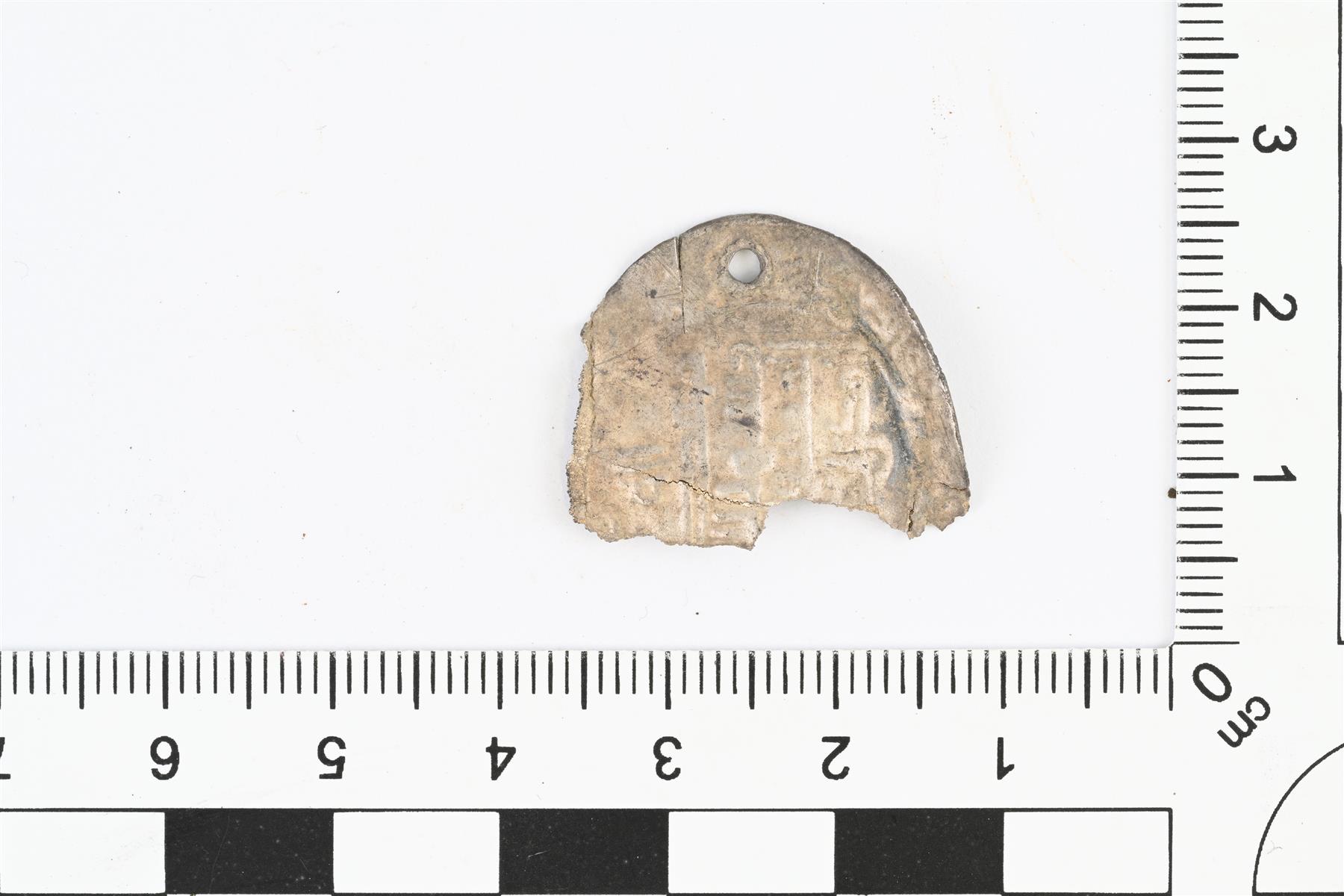| Ahmad ibn Ismail, dirhemi, Ash-Shash A.H. 295 (908/909 jaa.). Käytetty riipuksena, fragmentti. 1,76811g. Tunnistus Frida Ehrnsten, Kansallismuseon rahakammio. | |