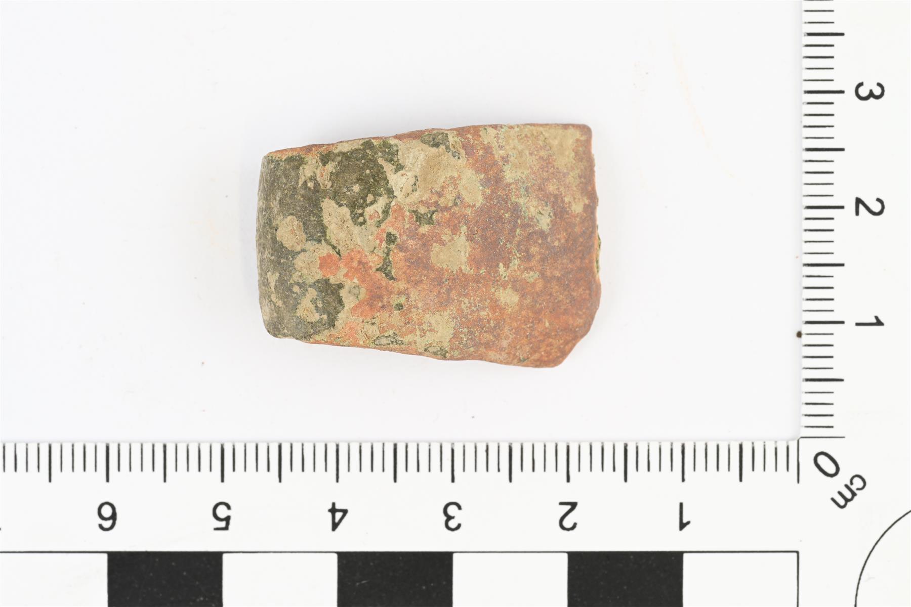 Rannerenkaan katkelma. Levenevä katkelma, jonka molemmat päät katkenneet. Poikkileikkauksessa ulkopinta kupera ja sisäpinta tasainen. Vääntynyt. | |