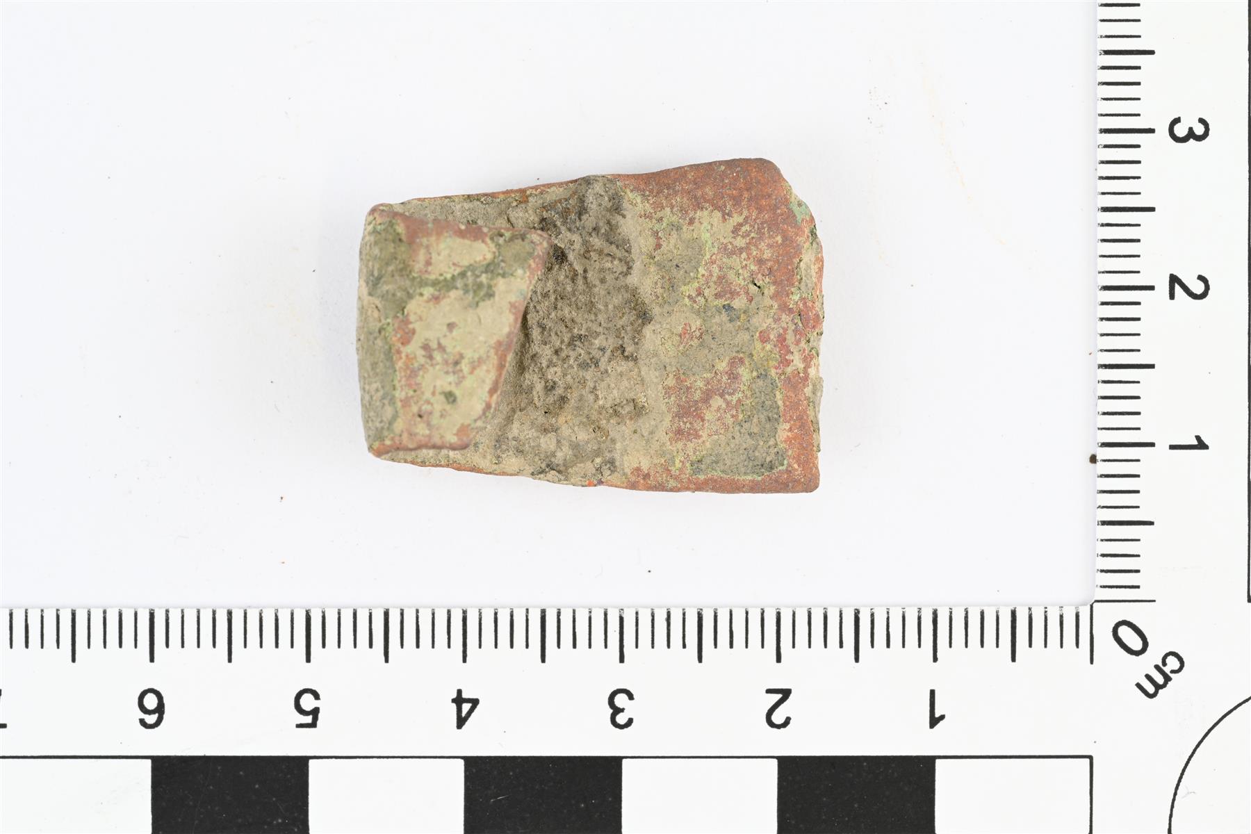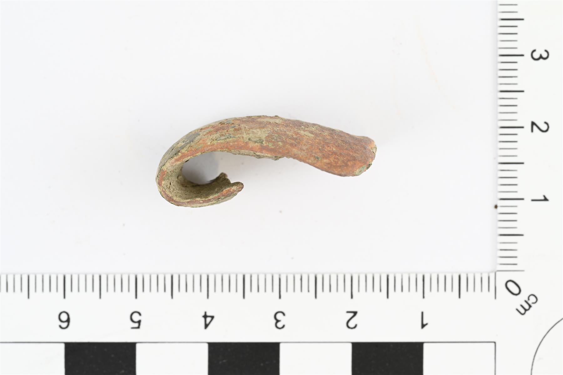 | Rannerenkaan katkelma. Levenevä katkelma, jonka molemmat päät katkenneet. Poikkileikkauksessa ulkopinta kupera ja sisäpinta tasainen. Vääntynyt. | |