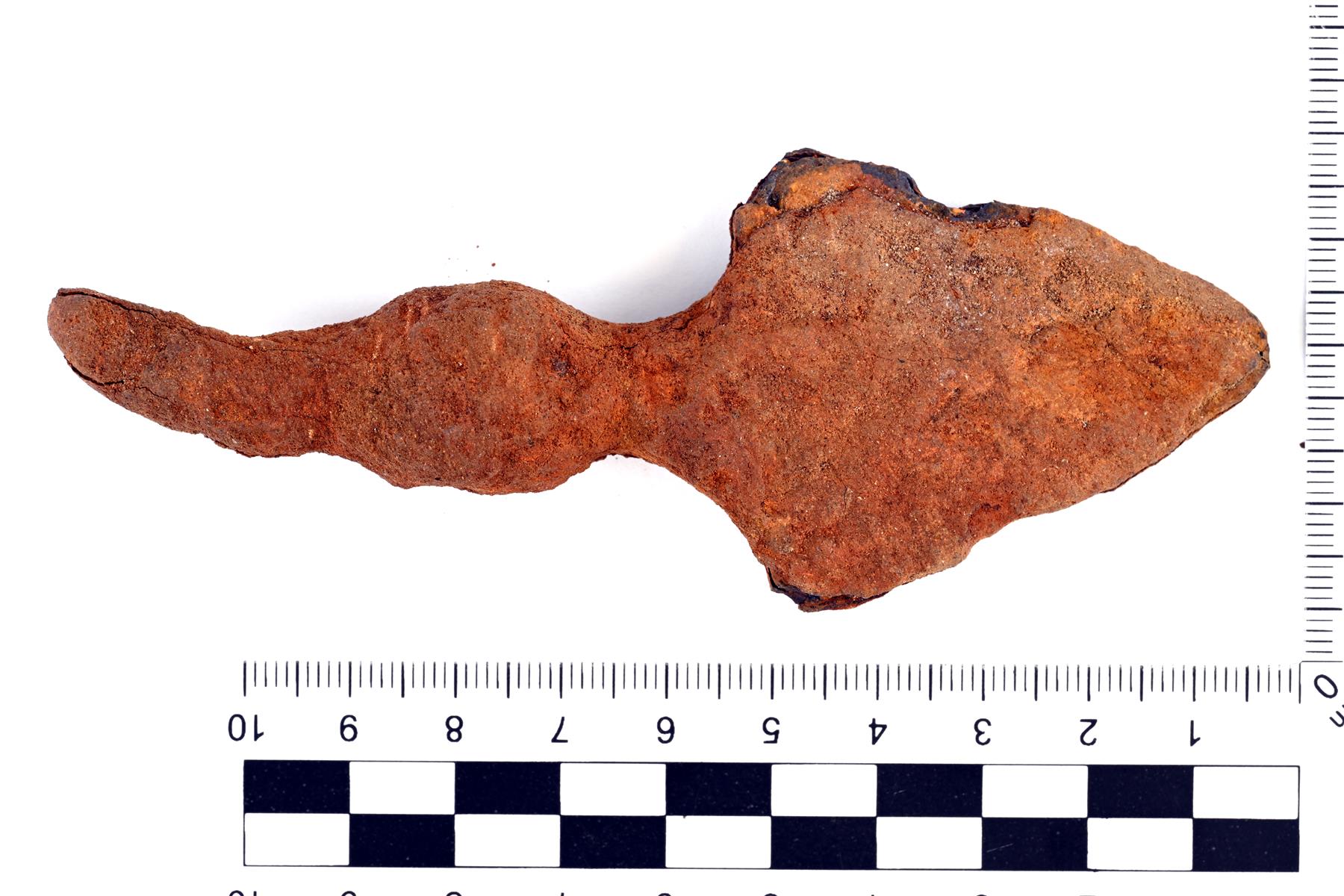 | Mahdollinen ruotokeihäänkärjen kärkikatkelma. Lehti on kolmiomainen ja sen levein kohta on lähellä tyveä. Ruodon yläosassa on pyöreä paksunnos. Paksun korroosiokerroksen peitossa. | |