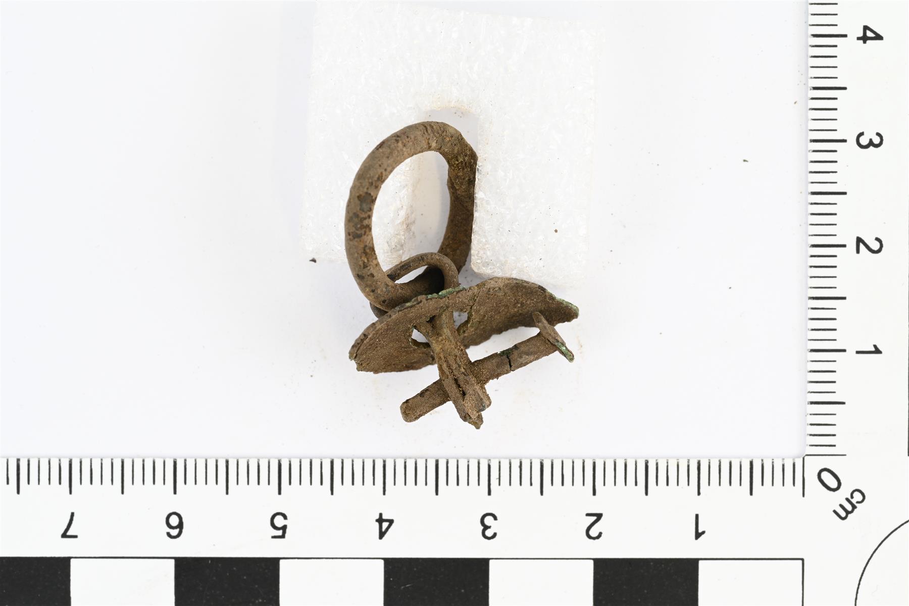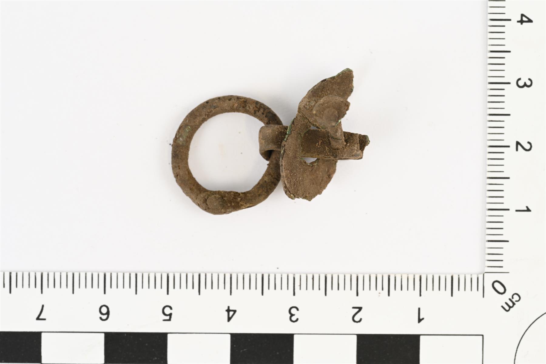 | Kupariseosesineen katkelma. Katkelma kupariseoslevyä, jonka läpi kulkee kaksikerroin taivutettu kapean kupariseossuikaleen pala. Levyn toisella puolella suikale muodostaa lenkin, jossa kiinni pieni kupariseosrengas. Renkaan halkaisija 18 mm. Toisella puolella suikaleen päät litteästi vastakkain ja niiden läpi kulkee pieni kupariseosnaula. | |