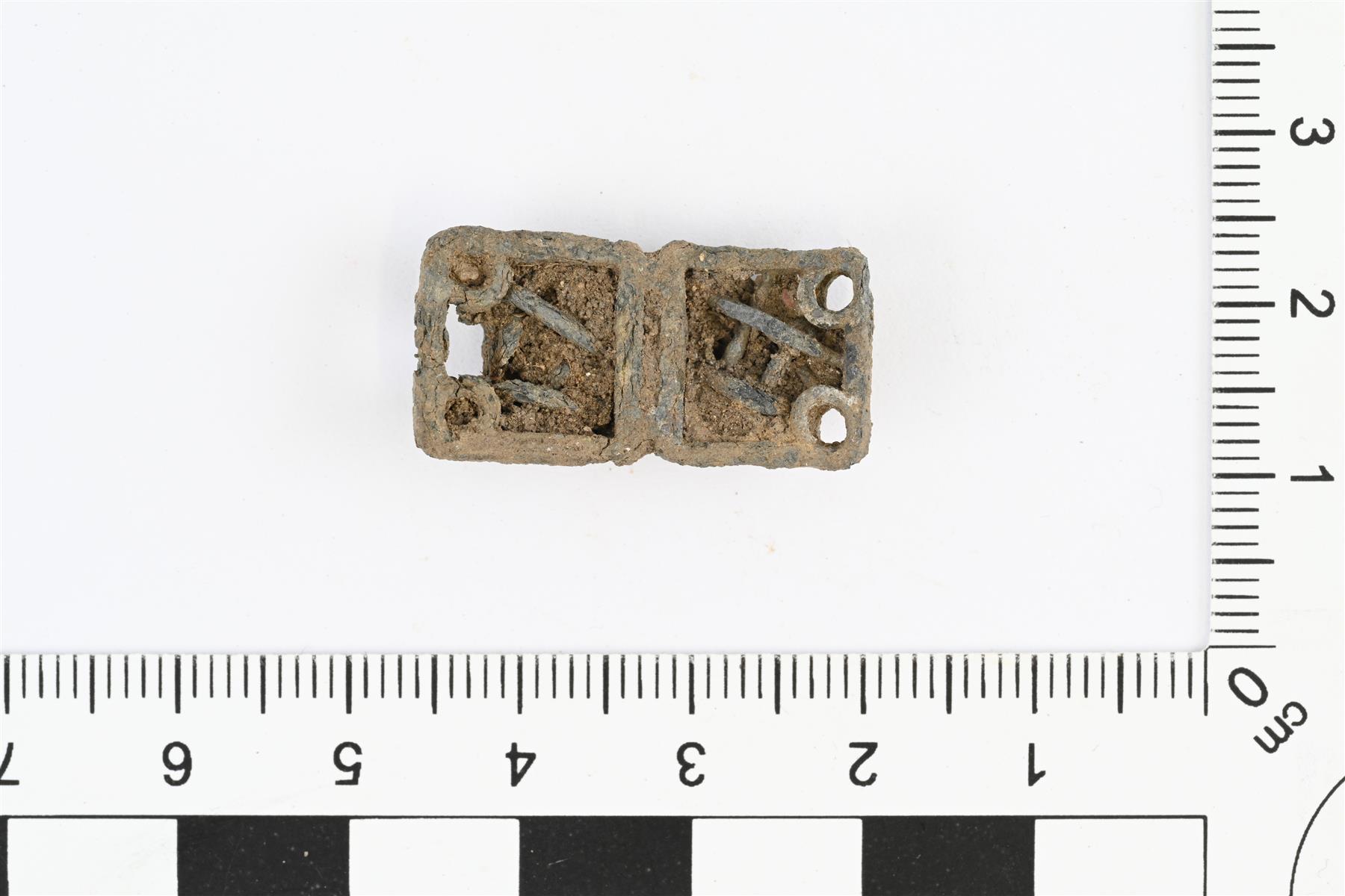 | Mahdollinen koristehela. Suorakulmion muotoinen. Kulmissa pienet pyöreät reiät. Muodostuu kahdesta neliöstä, joihin ikään kuin punottu kupariseoslankaa. | |