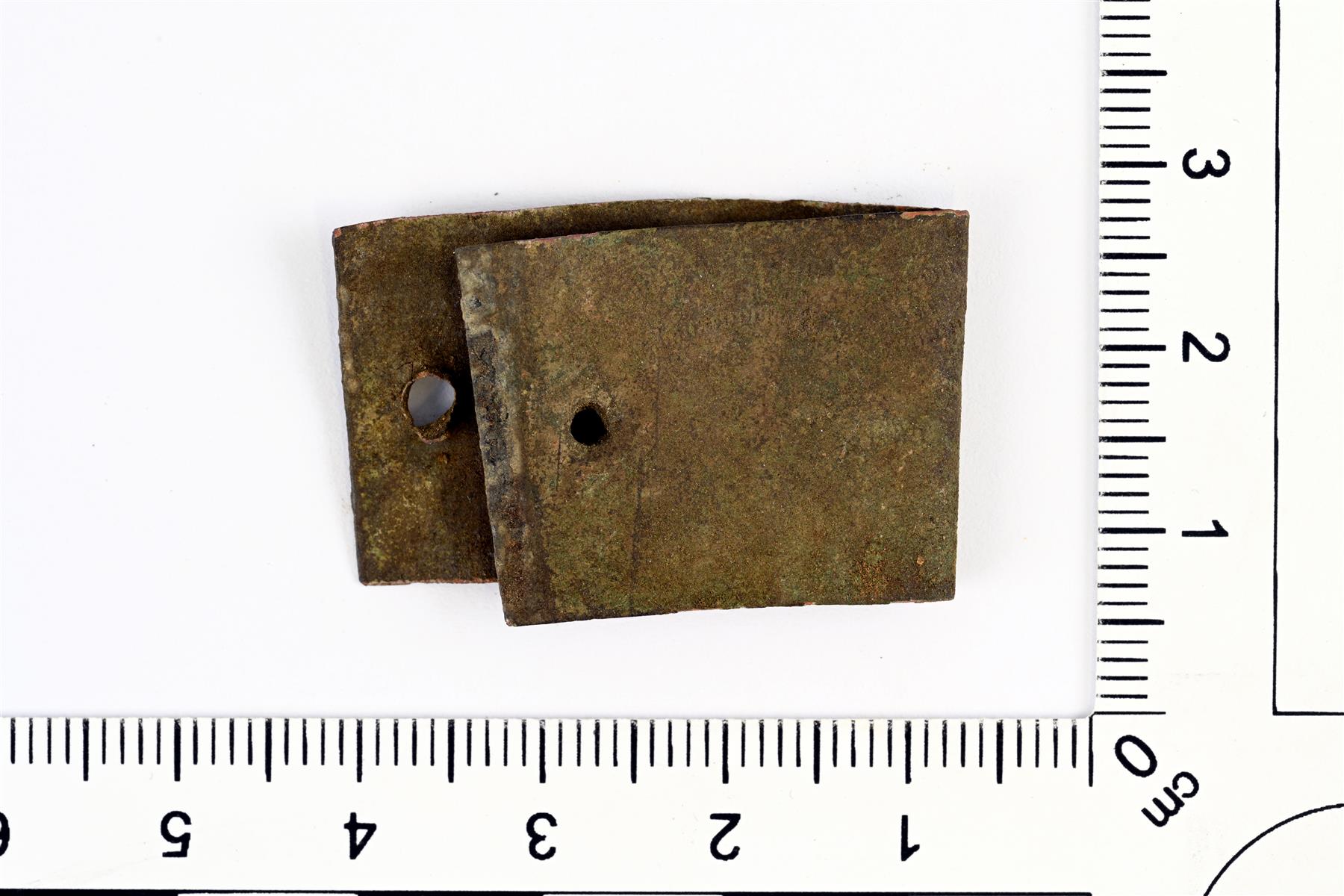 | Kupariseoslevyn katkelma. Molemmissa päissä on pyöreä reikä. Taitettu kaksinkerroin. Mahdollisesti jonkinlainen hela. | |