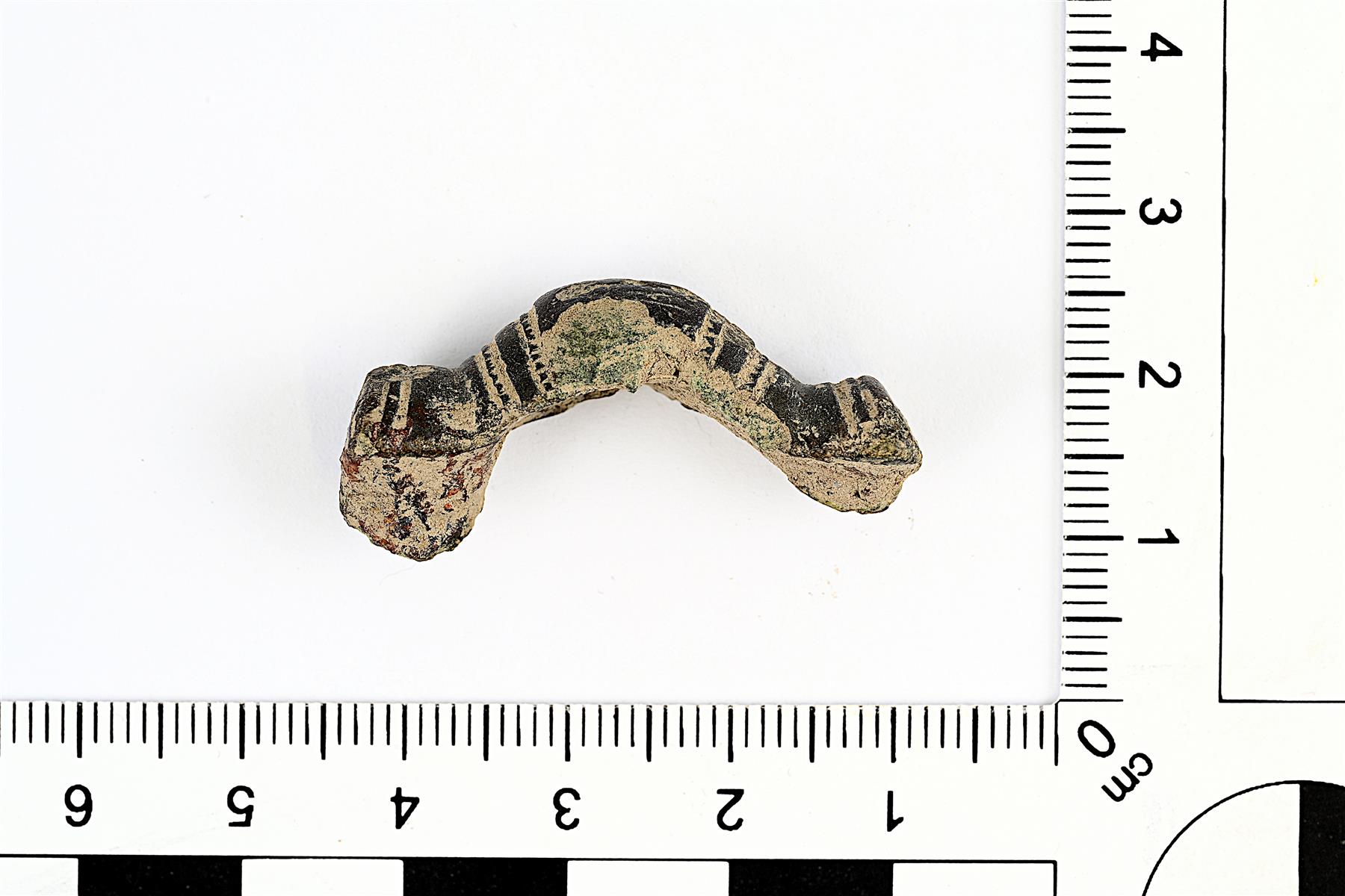 | Lähes kokonaisena säilynyt tasavartinen solki. Neulakota on hajonnut ja jousilaite puuttuu. Koverrettu taustapuolelta. Etupuolella on viivauurteilla ja helmiviivoilla tehtyjä koristekuvioita. Vrt. Kivikoski Abb. 378. | |