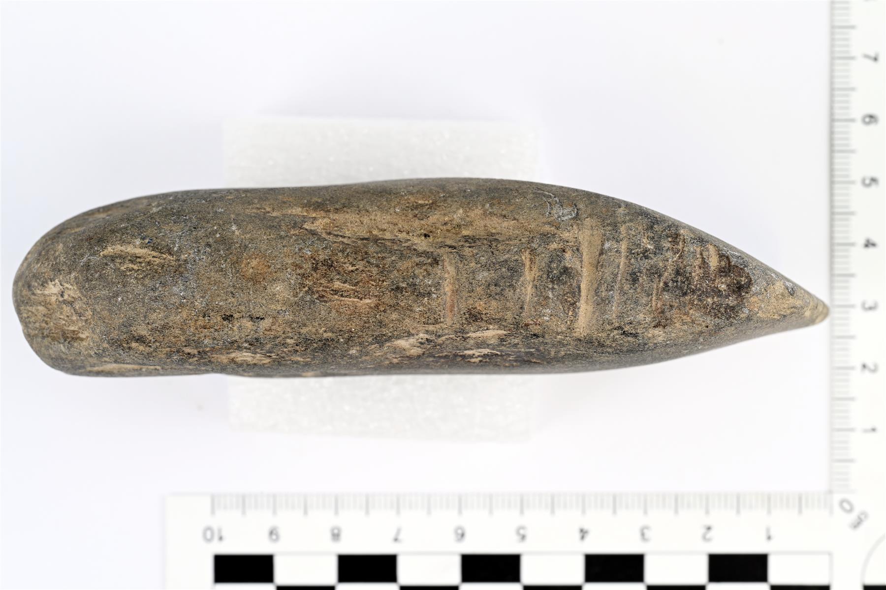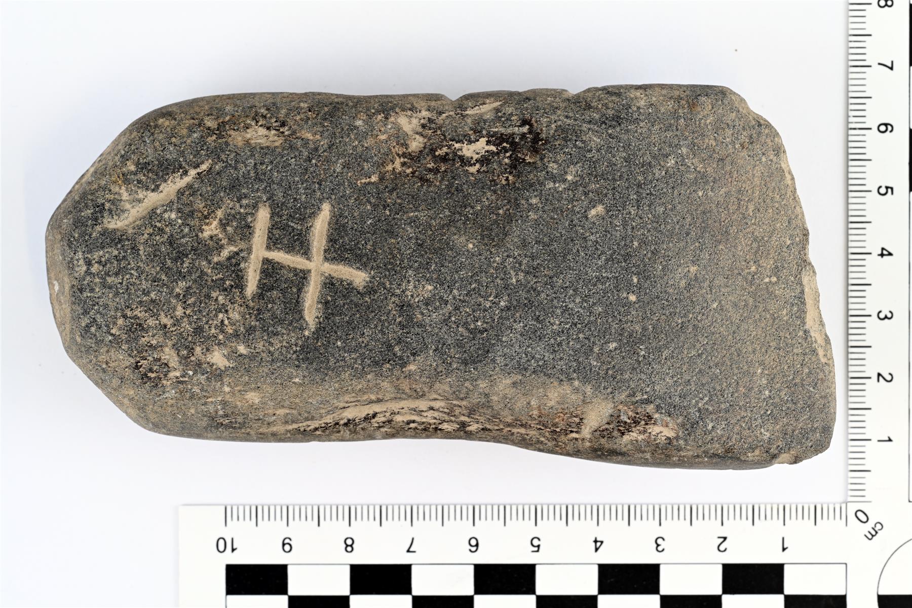 | Poikkiteräinen kirves. Teräosa ja ylä- sekä alapuoli on hyvin hiottu. Sivuilla ja kannassa on karkeampi työstöpinta tallella. Teränsuu on rikkoutunut ja epäsymmetrinen. Yhdelle sivulle on kaiverrettu poikittaisia viivauurteita ja alapinnassa on H:ta muistuttava jälki. Jäljet ovat todennäköisimmin historialliselta ajalta. | |