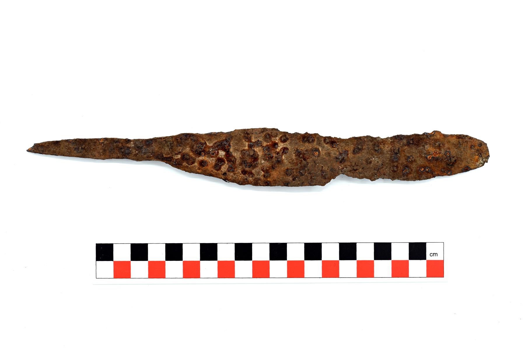 | Kaksiteräinen tikari. Kärki on pyöreä ja teränsuut ovat paikoin vaurioituneet. Ruoto on poikkileikkaukseltaan neliömäinen ja se kapenee kärkeä kohti litteäksi suorakaiteeksi. Muistuttaa jossain määrin Nakkilan Penttalan tikaria, ks. Salo Taf. 37: 1. | |