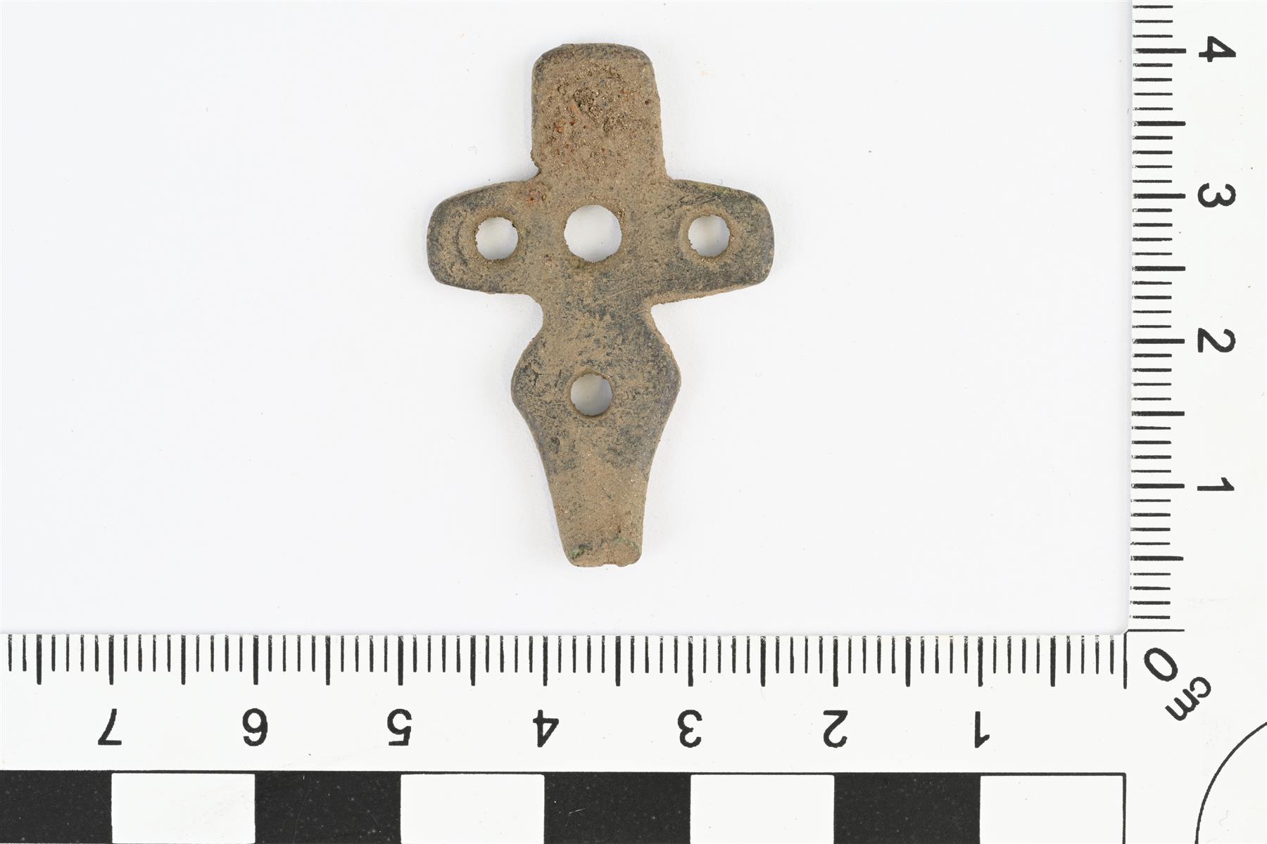 | Ristinmuotoinen kupariseosesineen katkelma. Ehjässä päässä kolme tasapituista sakaraa, joissa pyöreät reiät. Keskimmäisen sakaran reiässä jäännettä niitistä tms. Myös sakaroiden yhtymäkohdassa reikä. Neljäs sakara muita pitempi ja katkennut, ja sen sivuihin muotoiltu kolmiomaiset levennykset. Levennyksen kohdalla pyöreä reikä. | |