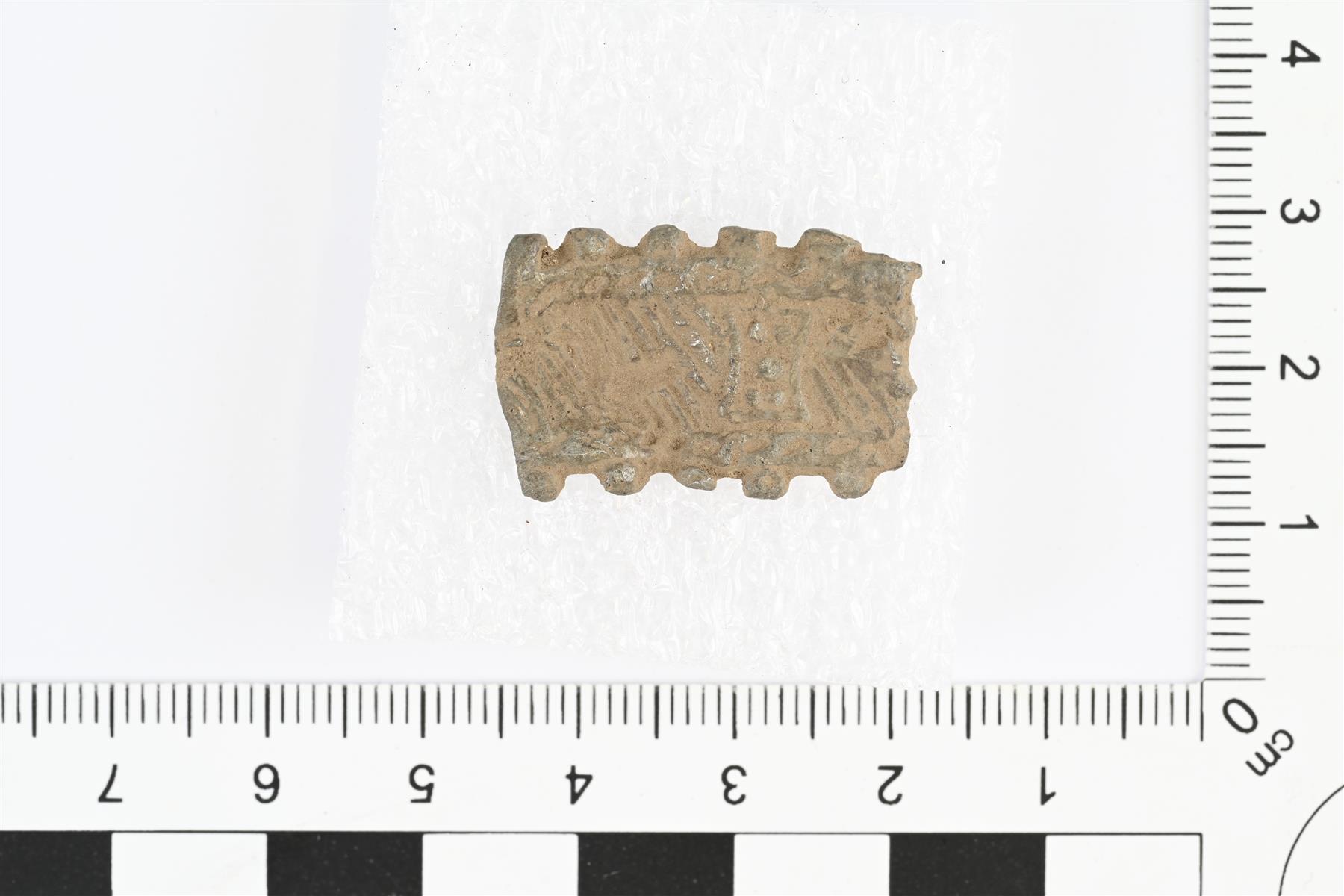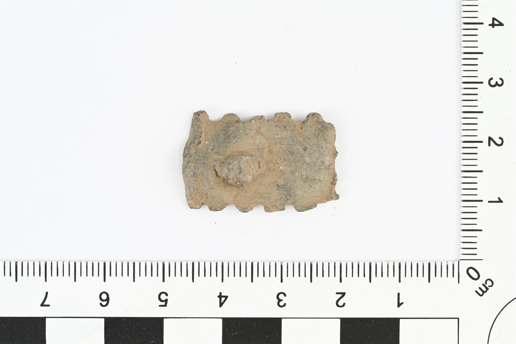 | Vyön tai valjaiden koristehela. Harmaata metalliseosta, luultavasti tinaseosta. Suorakulmion muotoinen, pitkissä sivuissa rivi sivuille ulkonevia nyppyjä. Taustapuolella kaksi kiinnitystappia. Etupuolella reliefikoristelua, jossa palloja ja viivoja. Paksuus mitattu tapin kohdalta, helan paksuus 3 mm. | |
