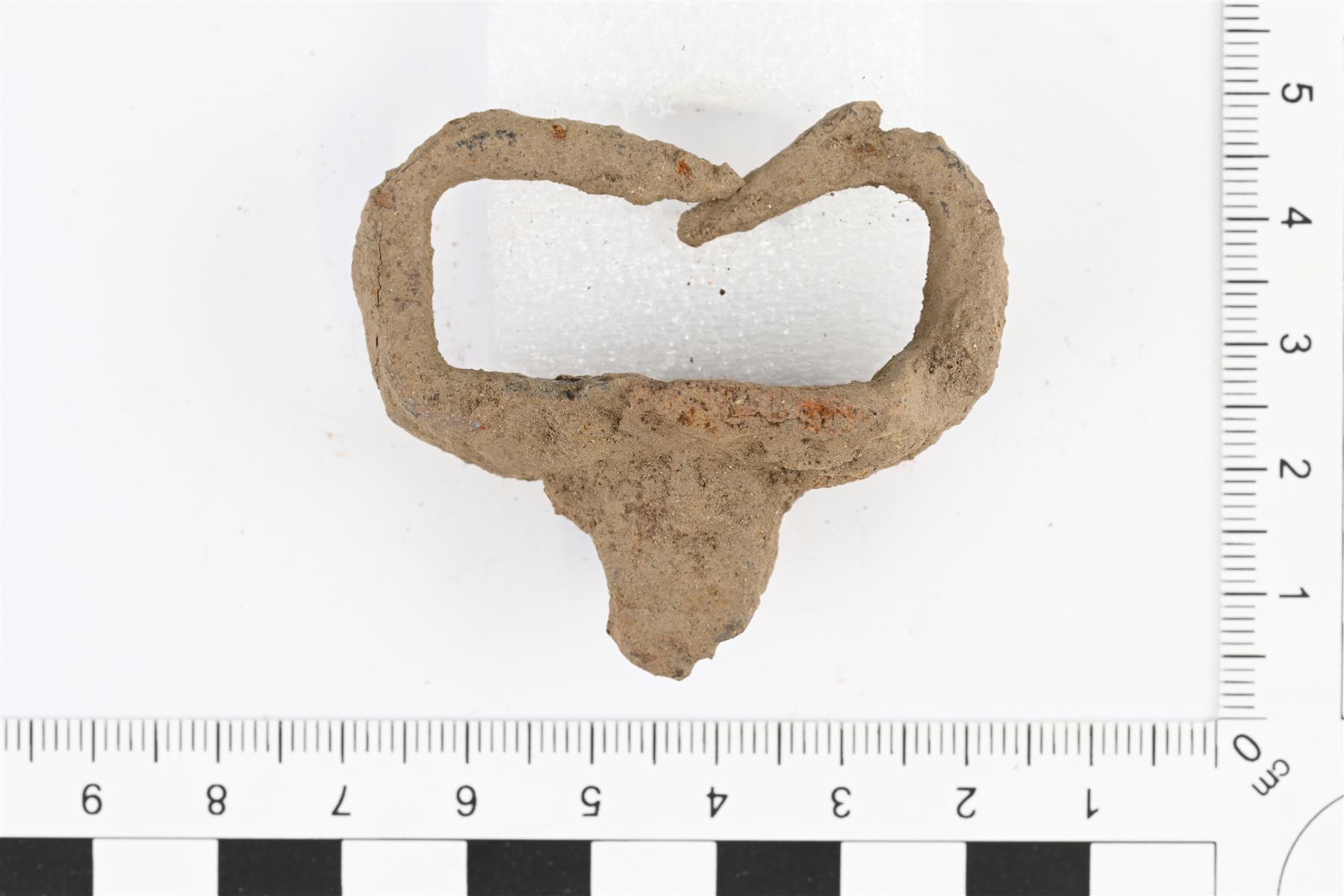 Kaksipiikkinen hevosen viskari, rautaa. Venytetyn kahdeksankulmion muotoinen levy, jonka keskellä toisella puolella kohoava ja suippeneva jäänasta. Levyn toisella puolella sen päissä ohuet taipuvat varret. Vrt. Kivikoski 1973, Taf. 110, Abb. 996.