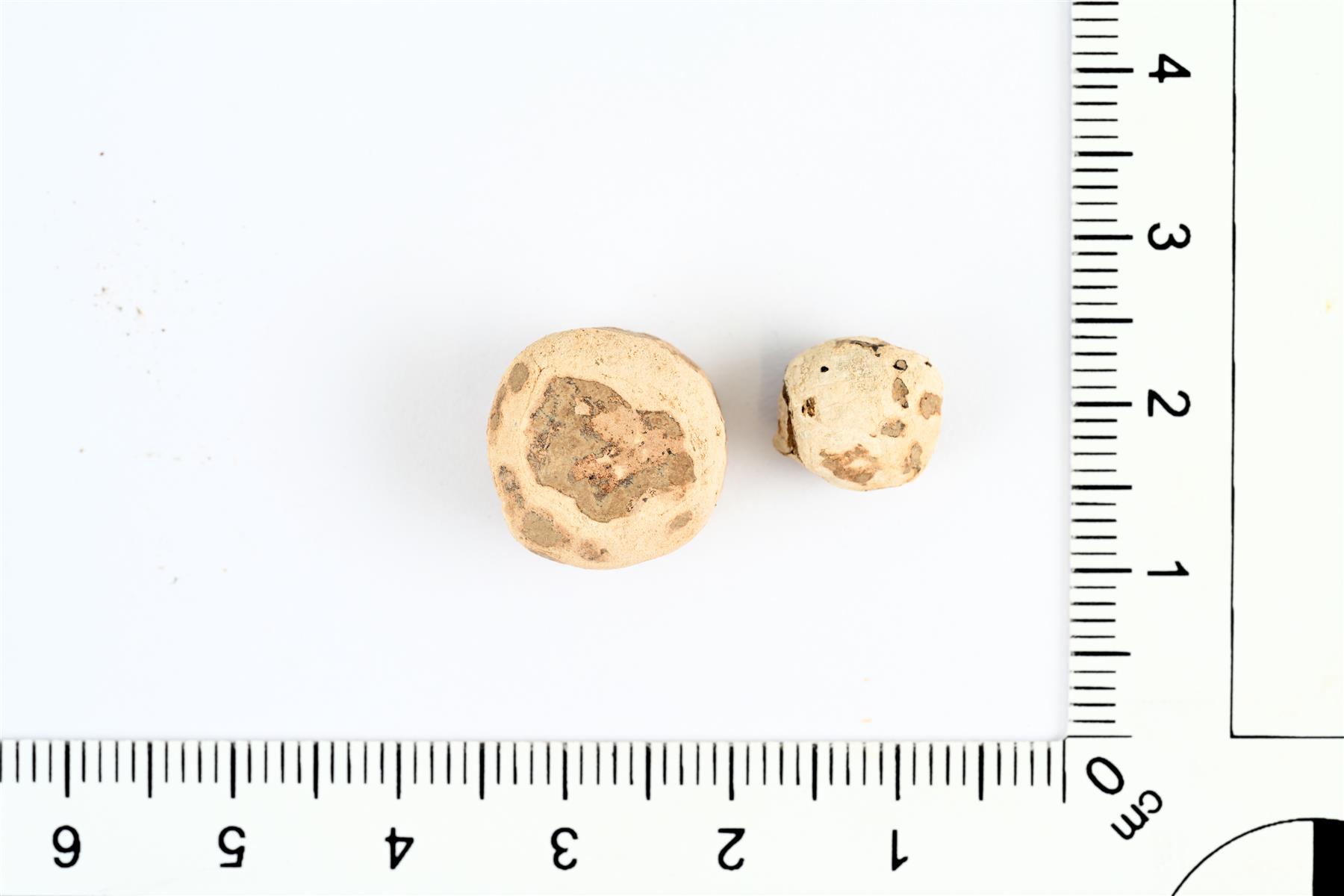 | Kaksi pientä lyijyn katkelmaa. Todennäköisesti raaka-ainetta metallivalua varten. | |