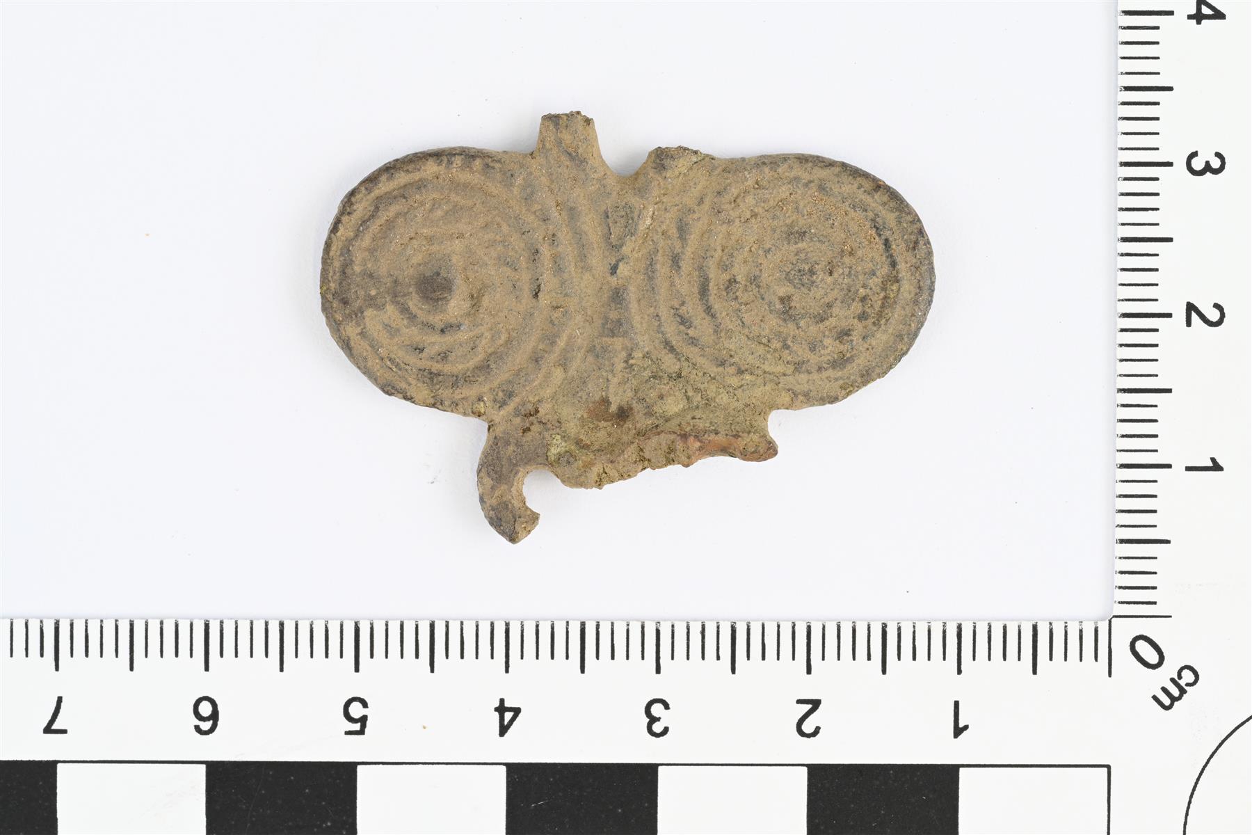 | Ketjunkantajan katkelma. Spiraalipäisen ketjunkantajan variantti, jossa spiraalikuvioiden tilalla sisäkkäisiä ympyröitä. Osa ympyröistä sileitä, osa nyörimäiseksi koristeltuja. Kaikki lenkit katkenneet. Toisessa päässä lenkkien murtumakohta vääntynyt. | |