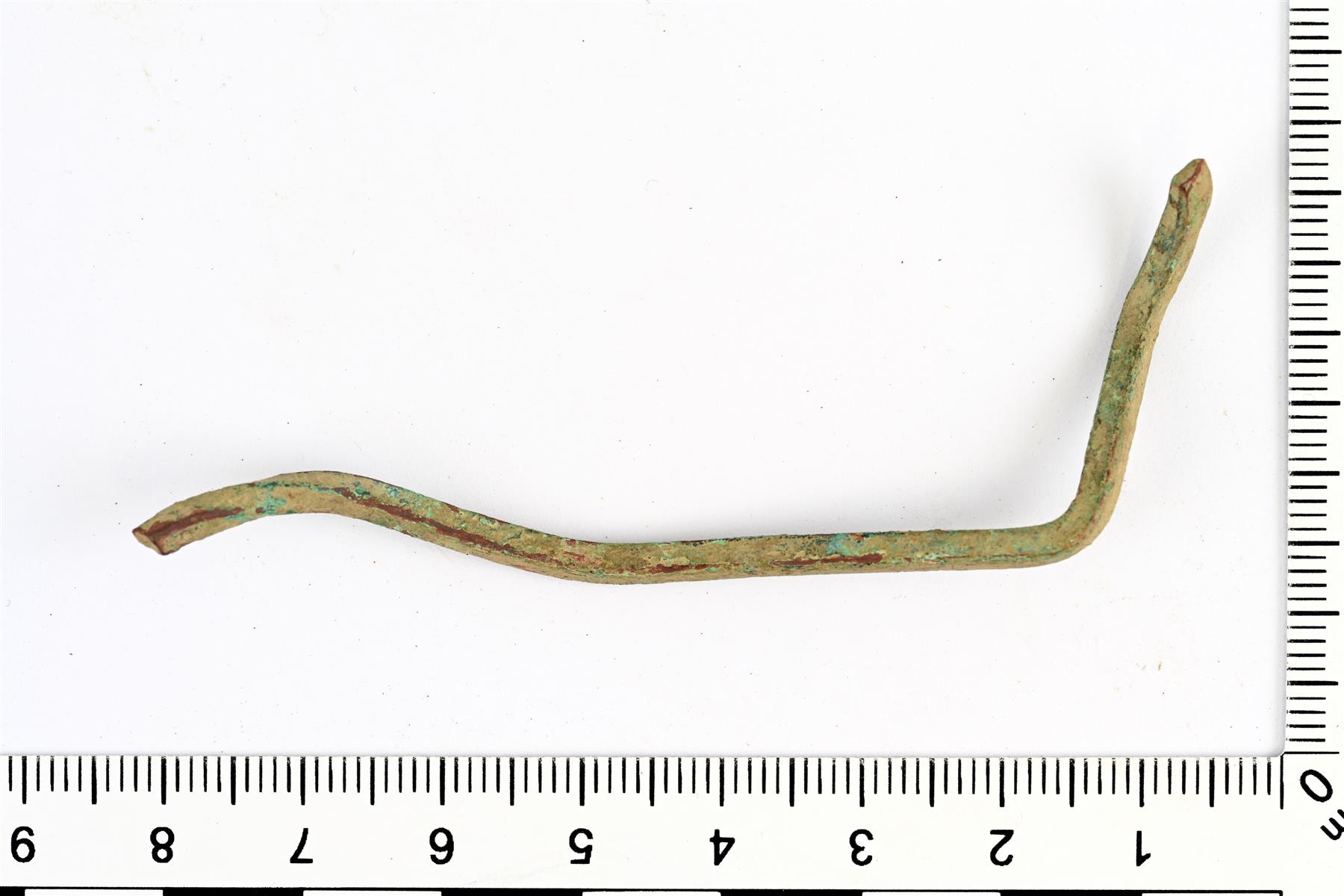 Poikkileikkaukseltaan neliskanttisen kupariseosvartaan katkelma. Mahdollisesti spiraalisormuksen aihio. Toisessa päässä on katkaisujälki. | |
