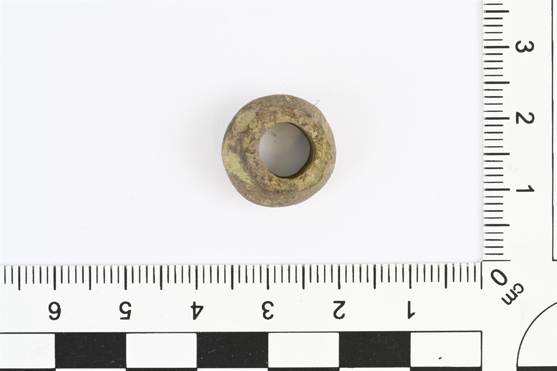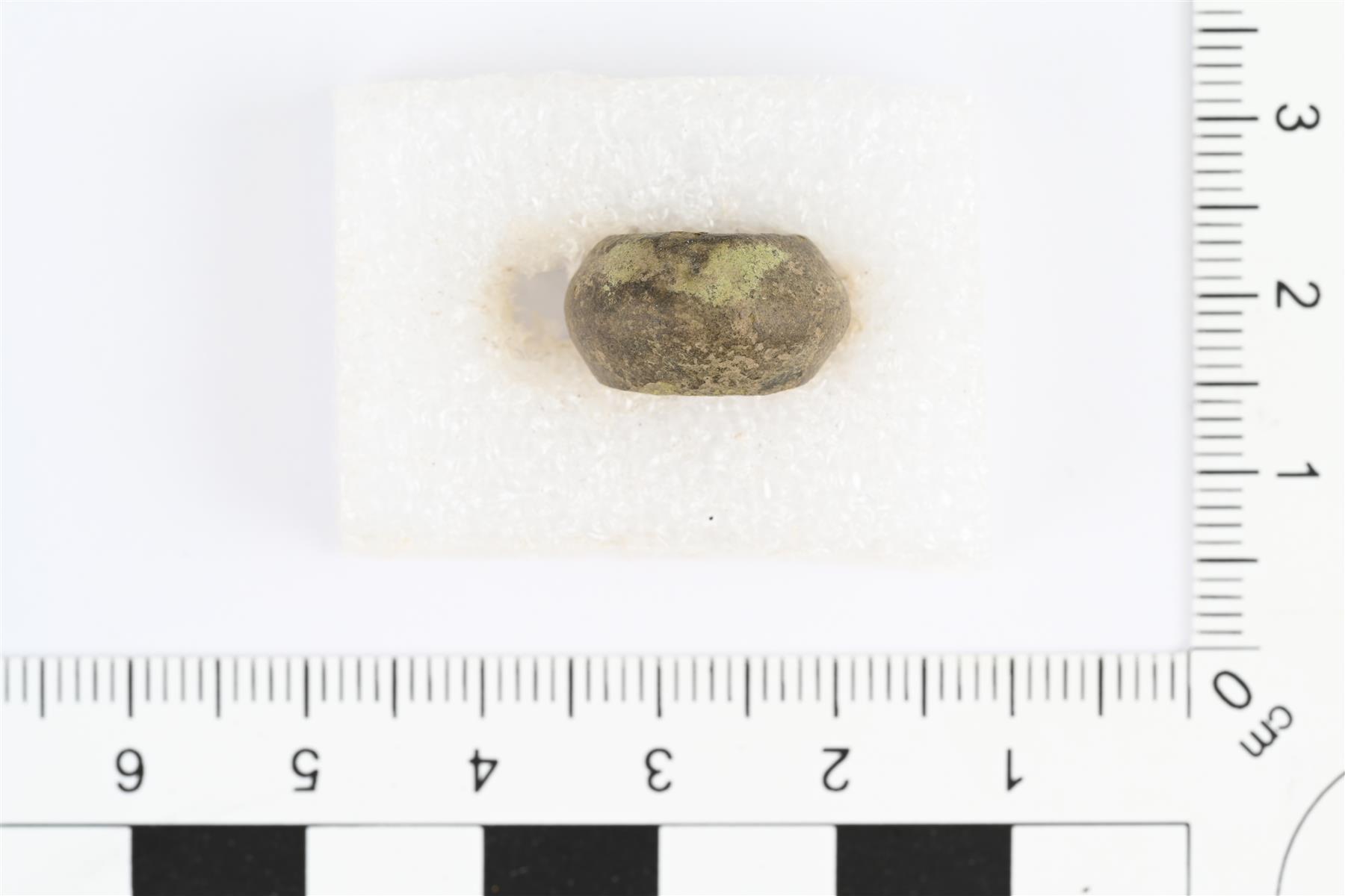 | Kupariseoshelmi. Epäsäännöllisen muotoinen. Sivusta katsoen matalan, pyöristetyn, kärjistä katkaistun kaksoiskartion muotoinen, toinen reuna toista korkeampi. Paksuus 7-9 mm. Päältä katsoen pyöreä, reikä ei keskellä vaan lähempänä matalaa reunaa. Reiän halkaisija 7 mm. | |