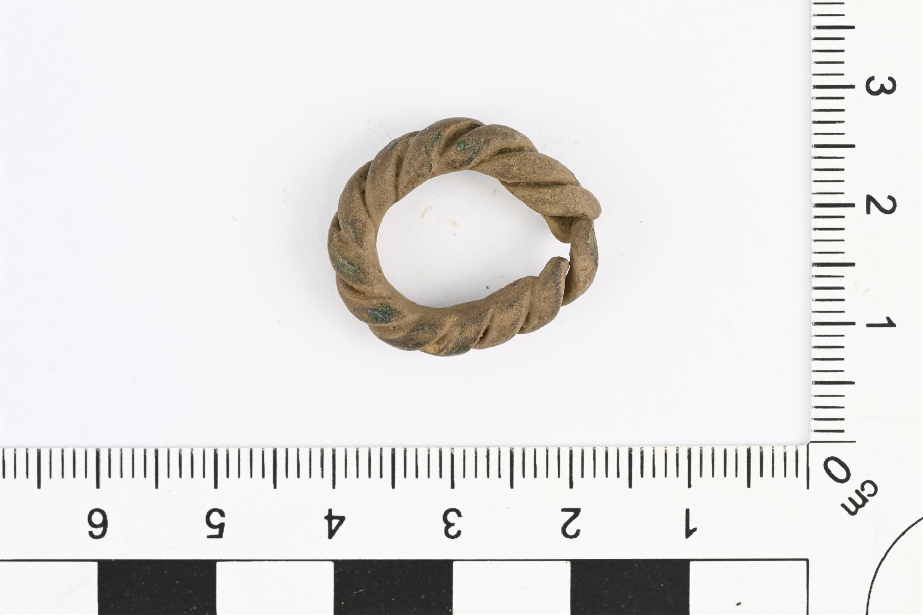 | Katkelma kupariseosvartaasta, joka on kierretty kolmesta ohuemmasta vartaasta. Taivutettu silmukan muotoon. Mahdollisesti kaularenkaan katkelma. Vartaan pituus noin 50 mm. | |