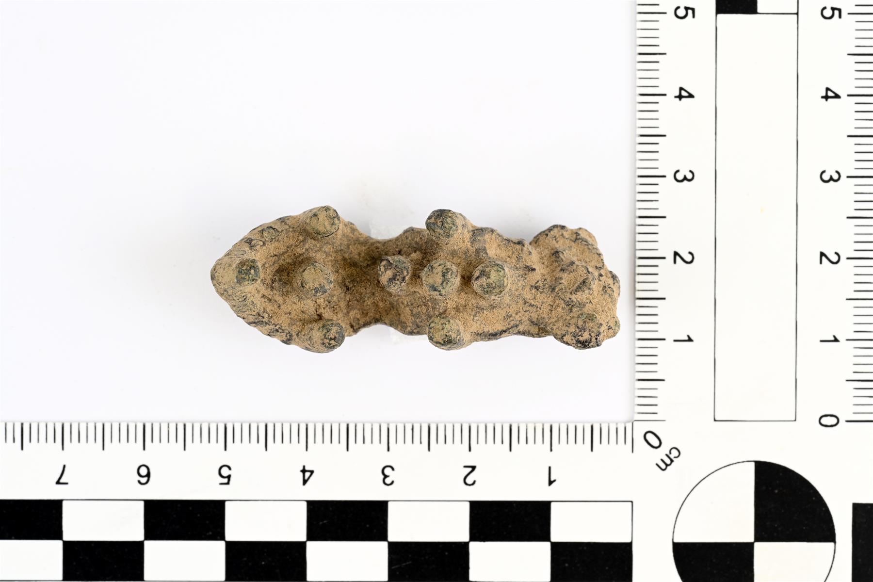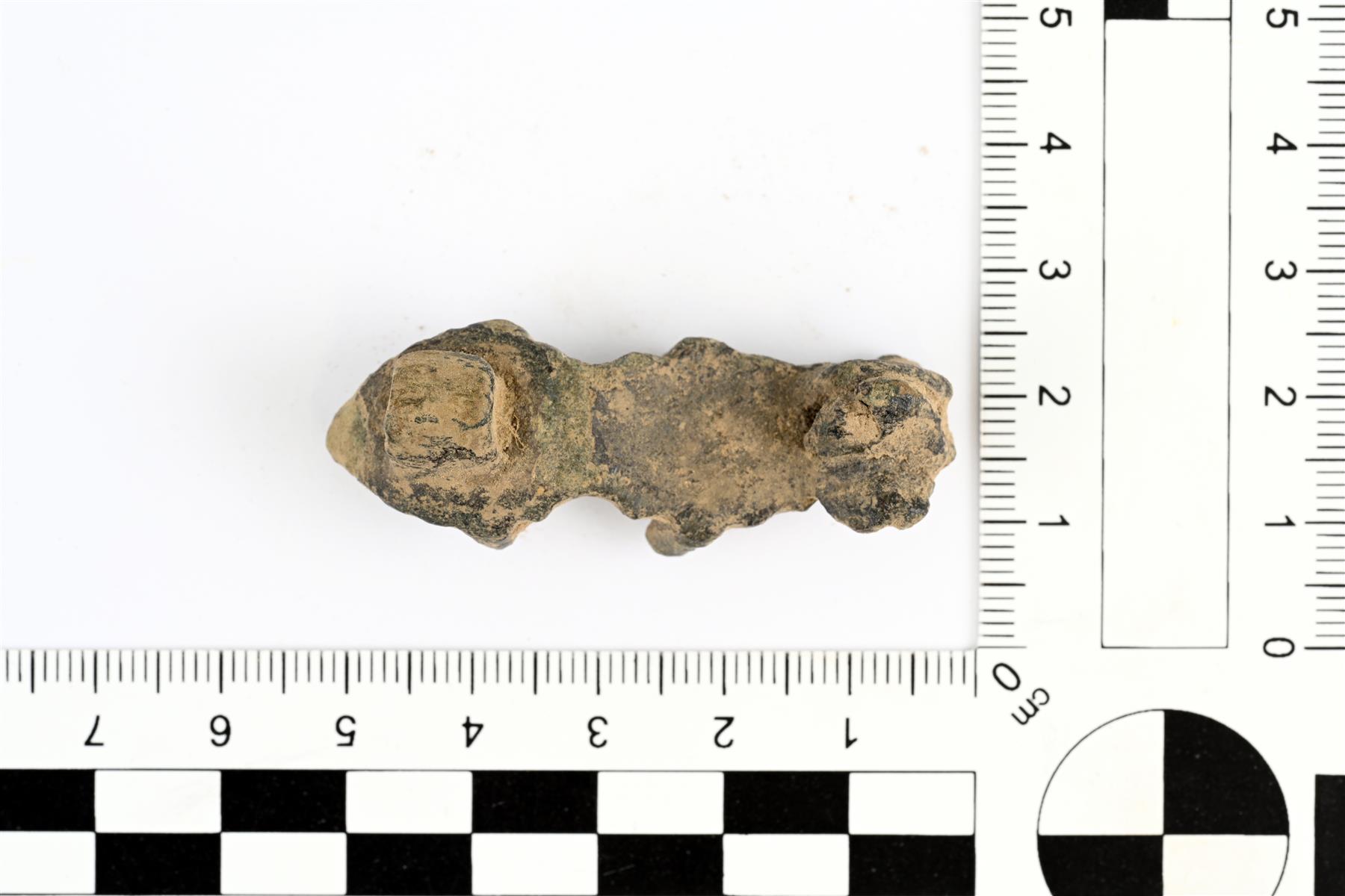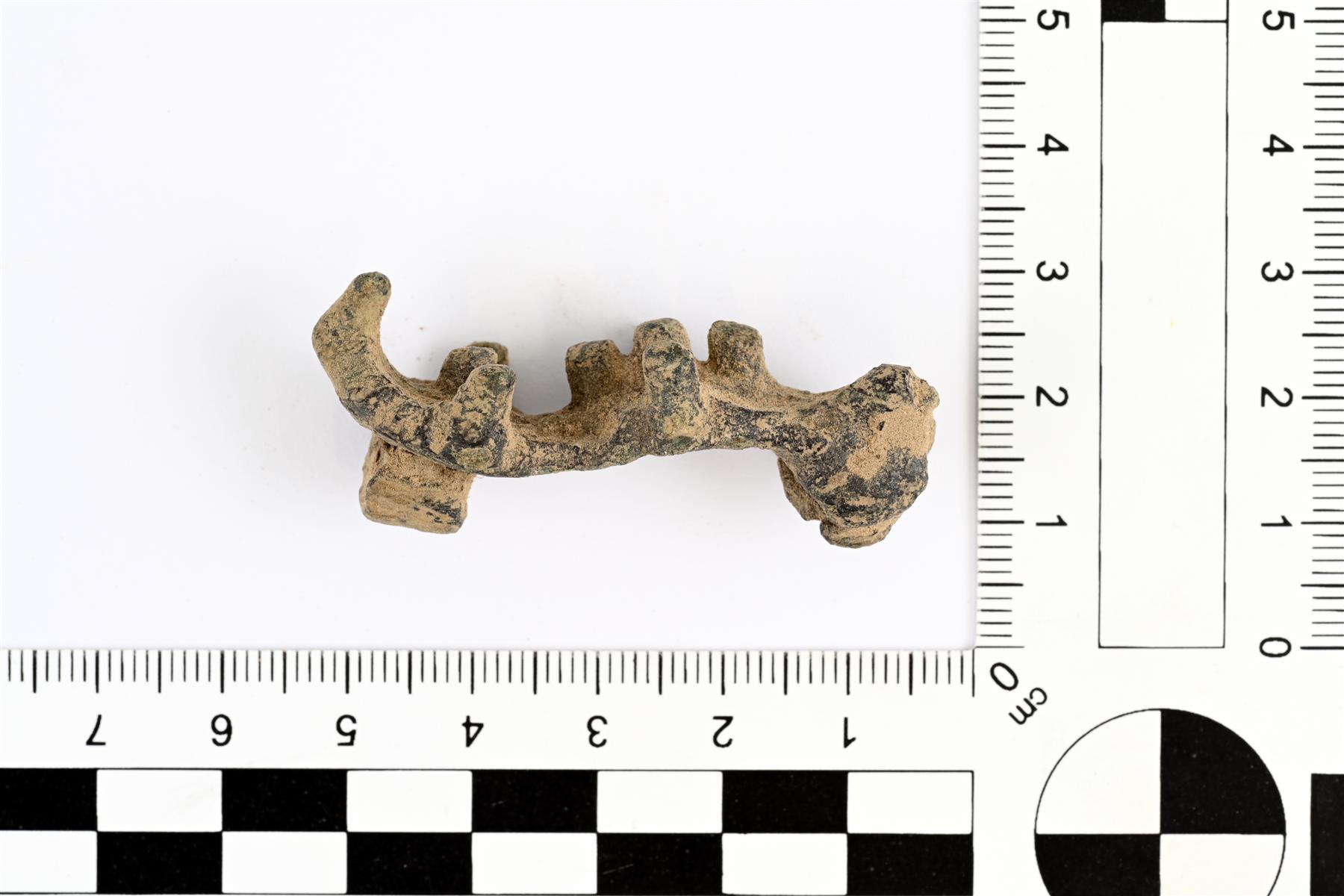 | Yhdestä päästä osittain sulanut tasavartinen solki. Keskellä ja säilyneessä päässä on koristeena tappeja. Tämän lisäksi koristeluna on käytetty viivauurteilla tehtyjä kuvioita. Taustapuolella on säilyneenä neulakota ja jousilaitteen kiinnityslenkit. | |