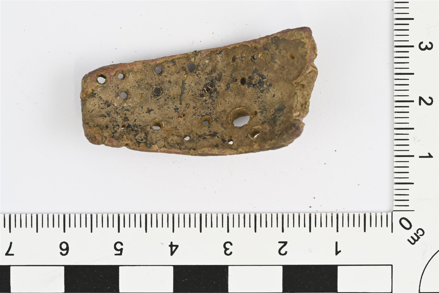 | Enkolpiorannerenkaan kannen katkelma. Katkelmassa hieman yli puolet kannesta, toinen pää murtunut ja toinen pää ehjä. Katkelma vaikuttaa tarkoituksellisesti murretulta. Pitkänomainen. Kapenee ehjään päähän siten, että sivut ovat hieman kuperat, leveys 14 - 21 mm. Poikkileikkaukseltaan koverankupera, myös sivusta katsoen kaareva. Levyn paksuus 3-4 mm, kuperuuden takia esineen paksuus 7 mm. Koristeltu. Murtuneessa päässä on lähes kokonaisena kannen keskelle asettunut rengas- tai ympyräkuvio. Ympyräkuviosta renkaan päähän kulkee pitkittäinen leveä matala kohovyö. Kohovyön molemmin puolin kahdessa rivissä pieniä pyöreitä reikiä, joista yksi ympyräkuvion vieressä sijaitseva reikä on muita suurempi. | |