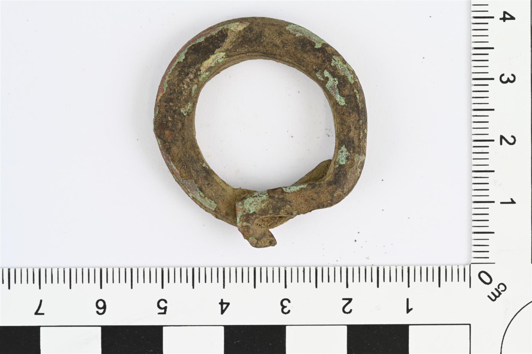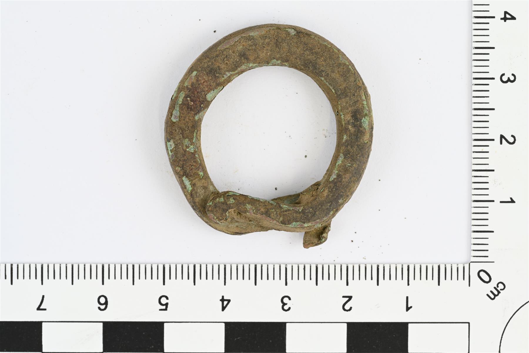 | Rengasmainen kupariseosesine. Rengas ei ole umpinainen, vaan sen päät menevät melko pitkältä matkalta limittäin. Päät kapenevat ja kiertyvät päästä hieman. Poikkileikkaukseltaan suorakulmaista varrasta, joka keskeltä paksumpi kuin päistä. Vartaan paksuus keskeltä 5,5 mm. Renkaan paksuus kohdassa, jossa päät ovat limittäin, on 7 mm. | |