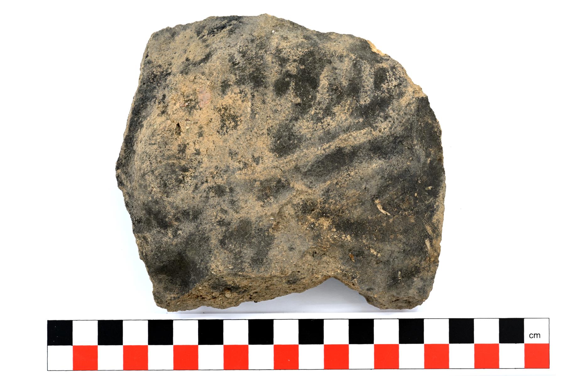 Todennäköinen savitiivisteen pala. Muodoltaan hieman kupera. Sisäpinta on jätetty karkeaksi ja se on tummunut. Ulkopinta on hyvin epäsäännöllinen. Sekoitteena on palanutta savea ja kiviä. Huokoisuutta on melko vähän. | |