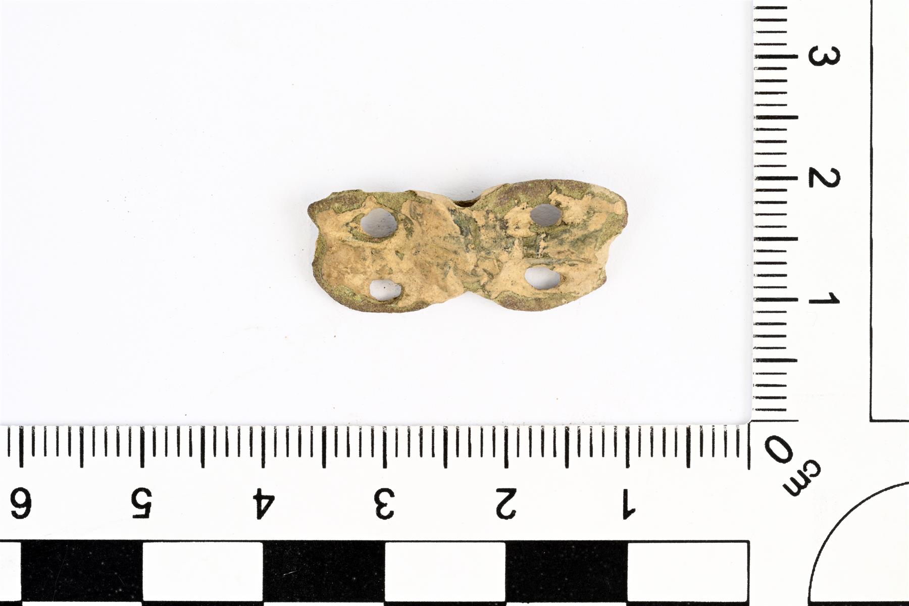 | Perhosmainen koruesine. Kummallakin sivulla on kaksi puhkonaista kuviota. Taustapuolella on ripustuslenkki. | |