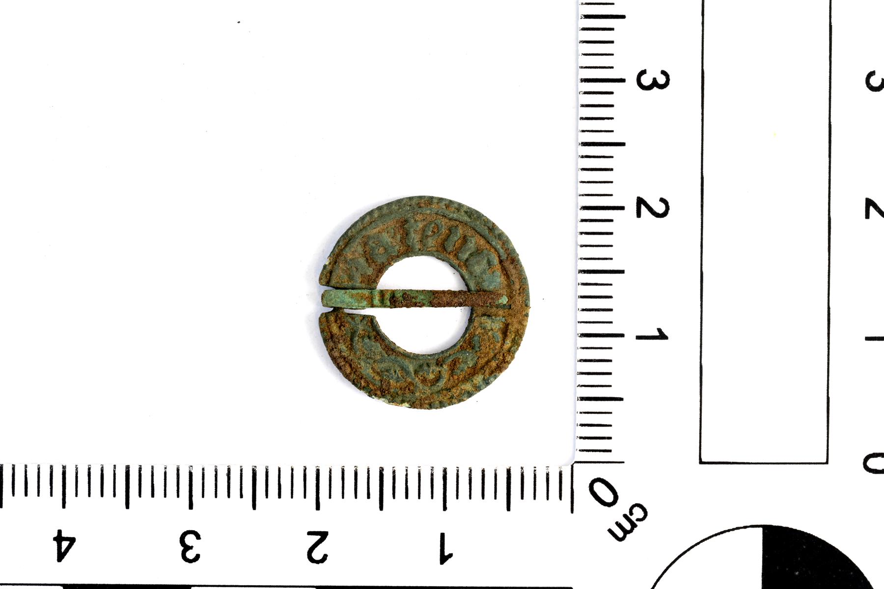 | Pienikokoinen ja hyväkuntoinen kehäsolki. Neulan kiinnityskohta on kavennettu. Neula on koristettu yläosasta muutamalla poikittaisuurteella. Soljen kehän yläreunassa on goottilaisella kirjaintyypillä kirjoitettu "Mateus". Alareunassa on korkokuvana kasviornamentiikkaa. | |