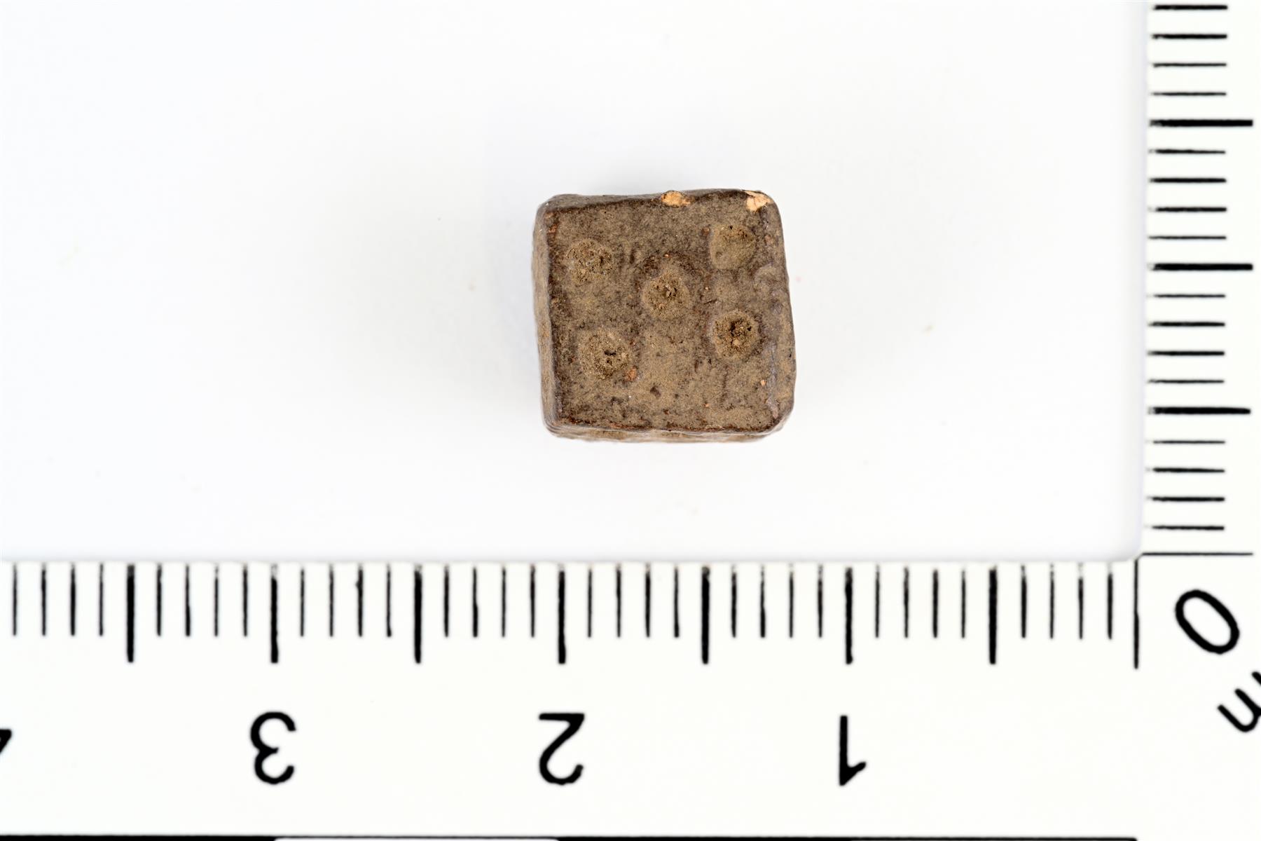 | Pienikokoinen lyijynoppa. Lähes neliömäinen muoto. Vastakkaiset silmäluvut ovat 1 ja 2; 3 ja 6; 4(?) ja 5. | |