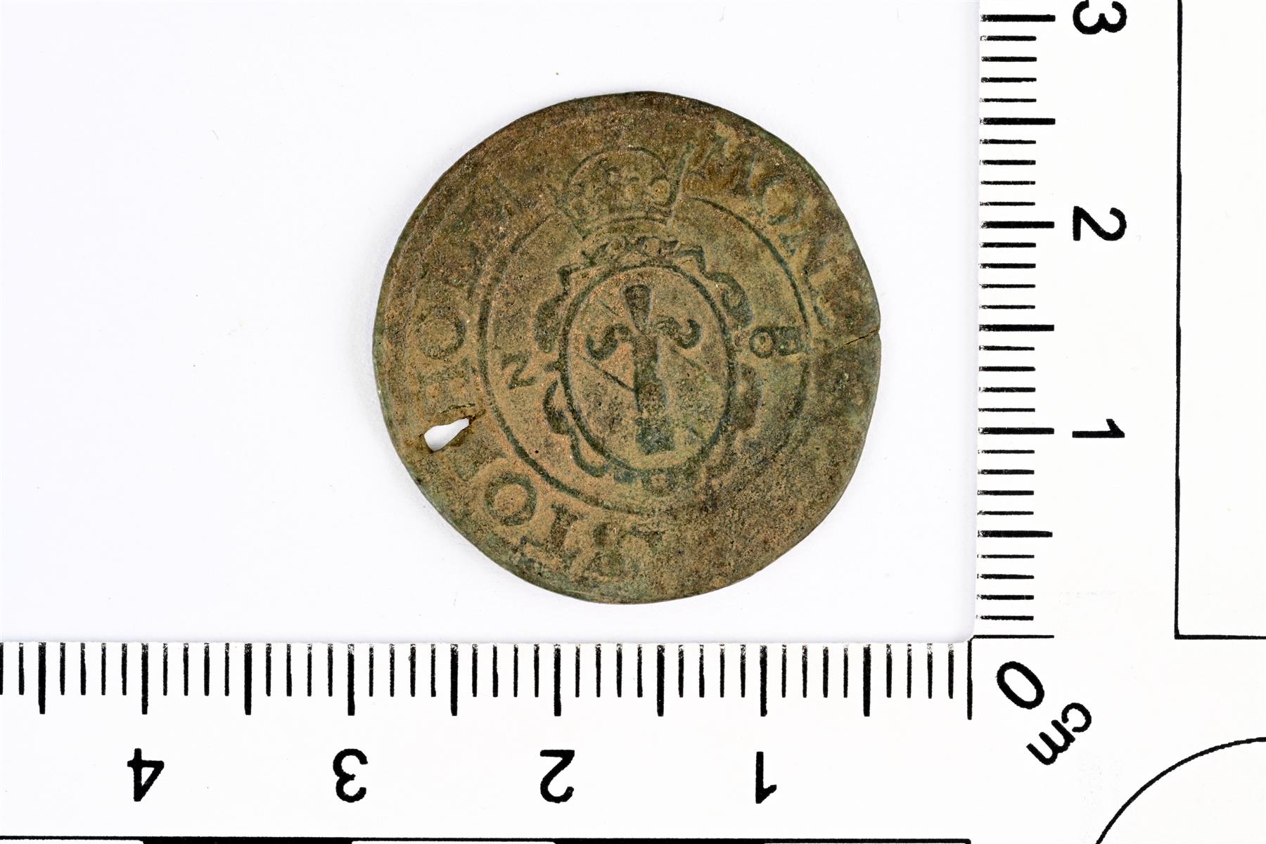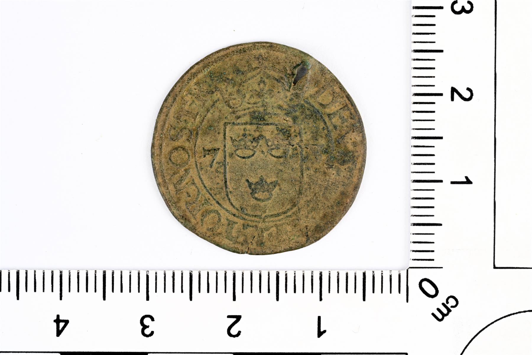 | Juhana III, 2 äyriä, Tukholma 1573 (SM 65c). Reunassa on kolmiomuotoinen reikä, lävistetty yhdeltä puolelta. Patinoitunut vihreäksi. | |