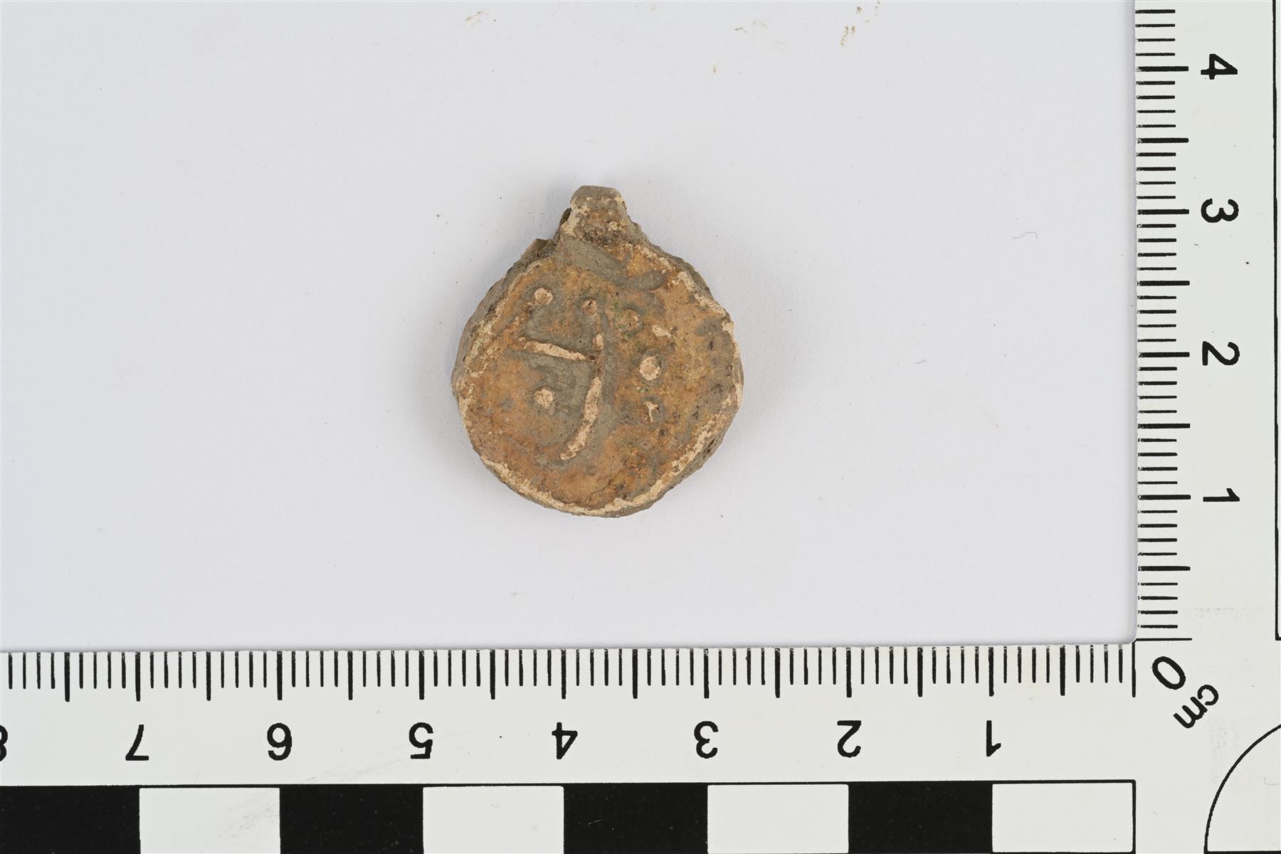 | Lyijyplombi. Molemmilla puolilla epäselvää viiva- ja pistekuviota. | |