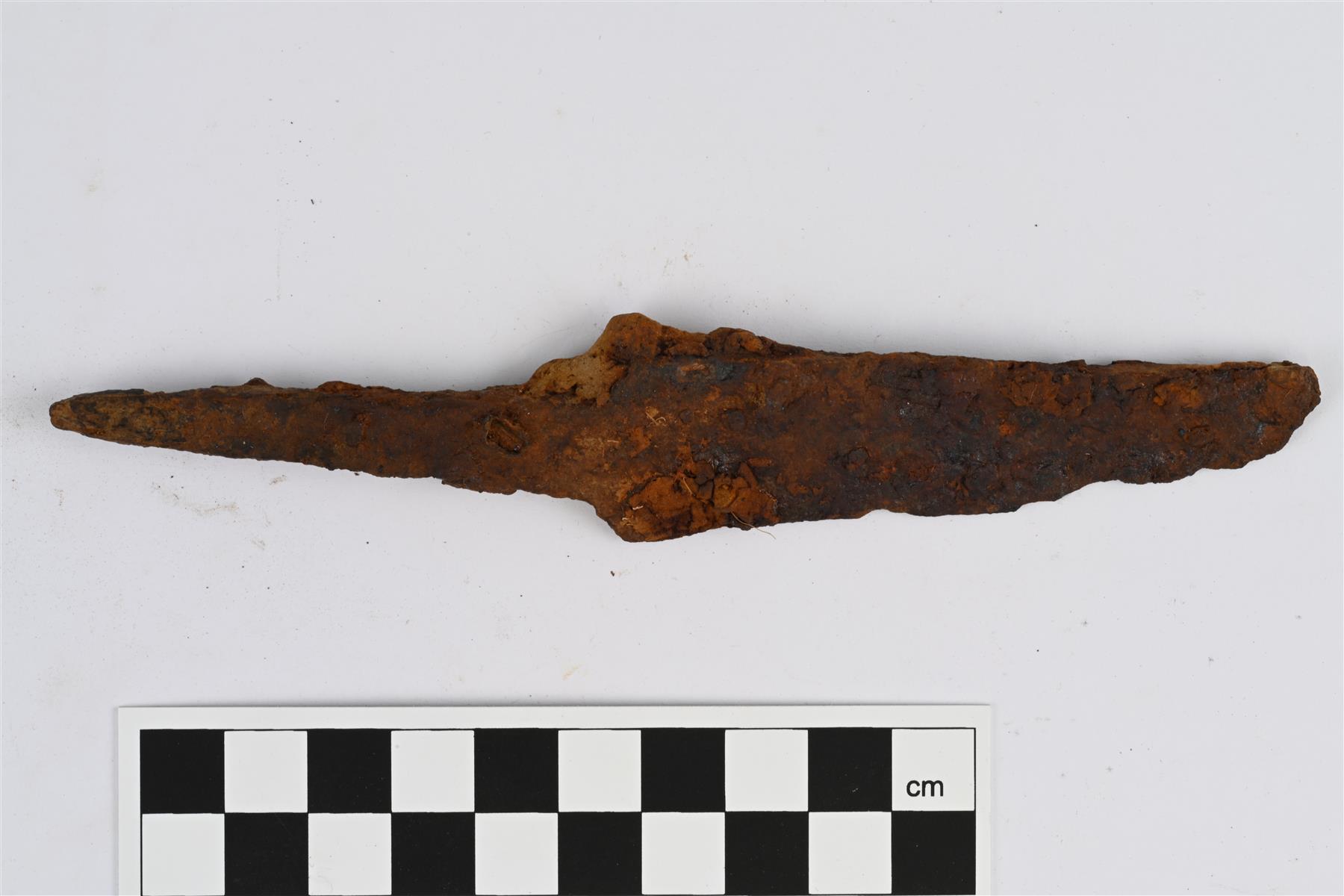 | Ruodollinen veitsenterä. Teränsuu osittain murtunut erityisesti kärjestä. Hamara suora, teränsuun jäljellä oleva osa suora. | |