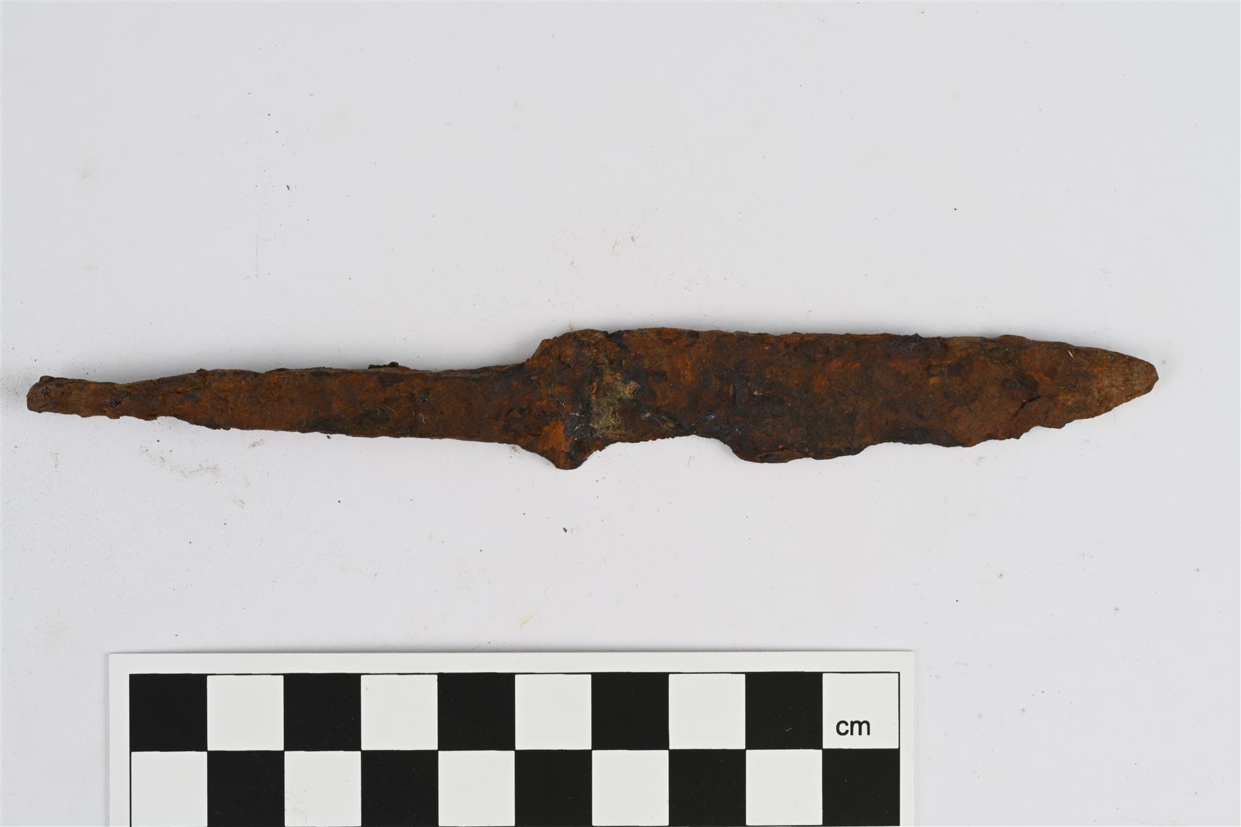 | Ruodollinen veitsenterä. Teränsuu murtunut lähes koko pituudeltaan. Hamara lähes suora, kärjestä kupera. | |