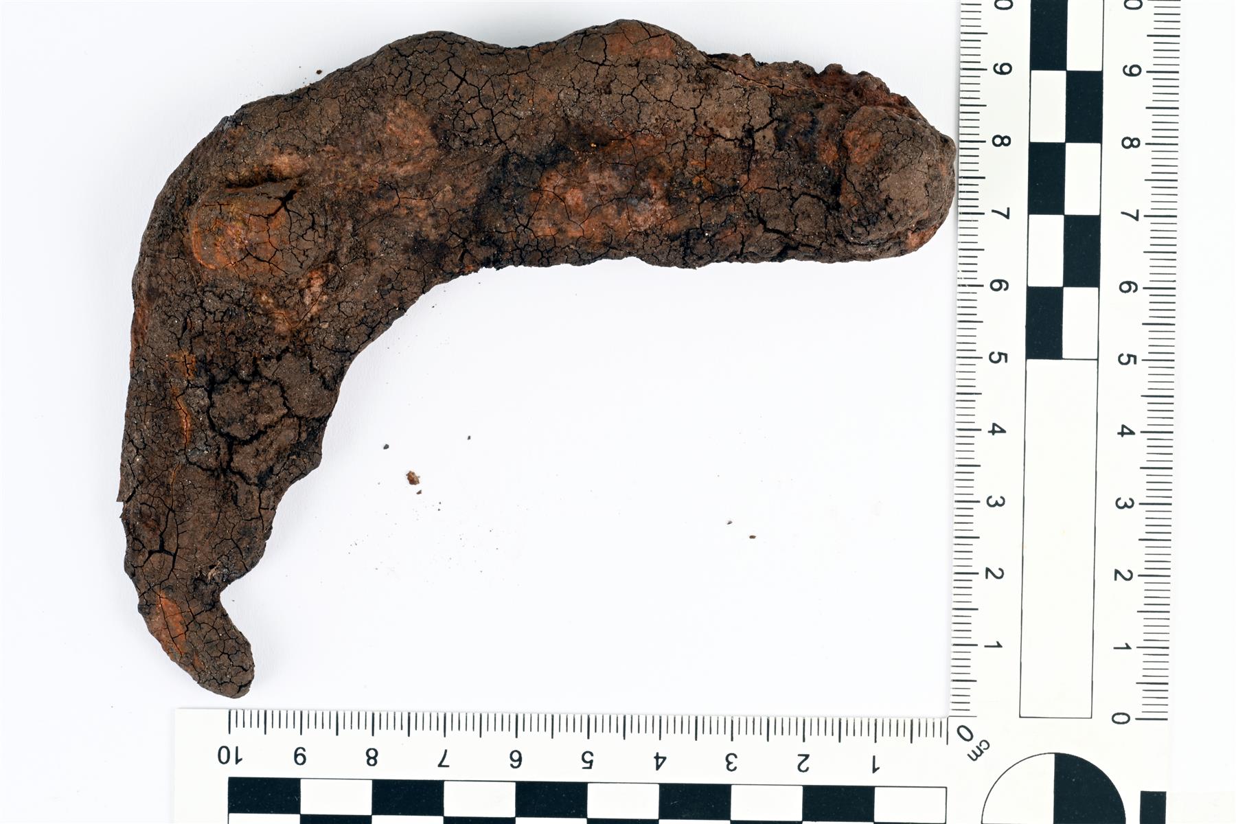 | Aaltoreunaisen hevosenkengän puolikas. Kaaressa näyttäisi olevan kolme reikää, joista yhdessä on naula tallella. Pääty on käännetty kaksinkerroin. Paksun korroosiokerroksen peitossa. | |