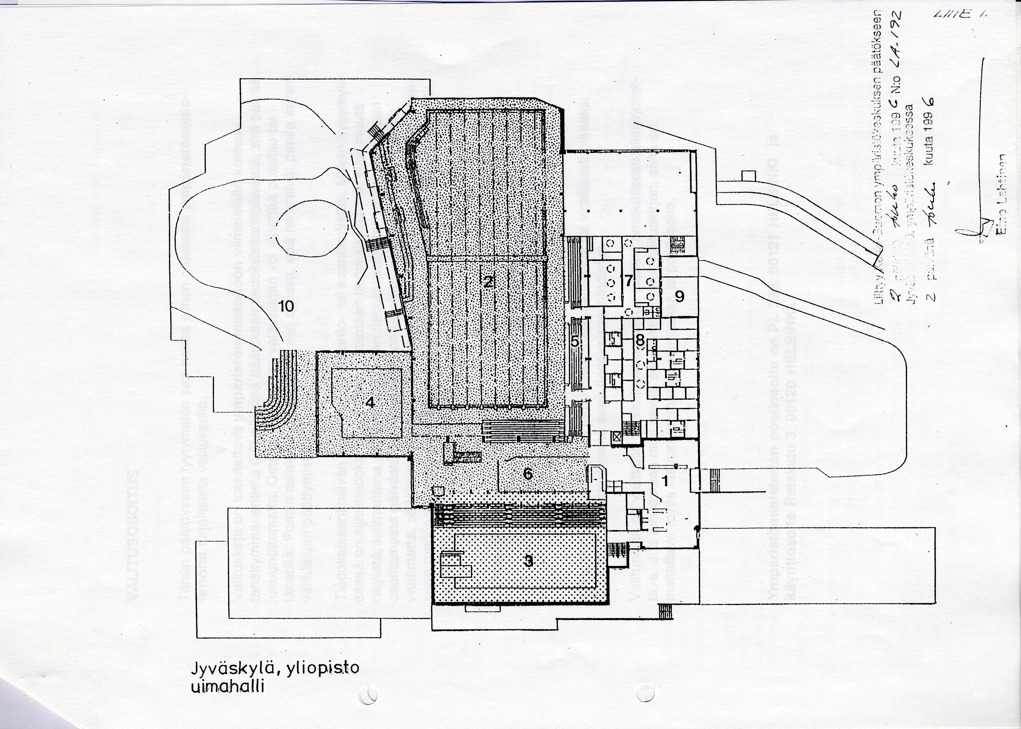 Jyväskylän uimahalli oli valmistuessaan vuonna 1955 ensimmäinen Helsingin ulkopuolelle rakennettu yleinen uimahalli. Uimahalliin rakennettiin 1960-luvulla lisää lasten opetusallas samalla kun tehtiin muutoksia myös alkuperäisissä sisätiloissa. Lastenallas oli myös ensimmäinen Suomessa yksinomaan lasten opetuskäyttöön rakennettu yleisessä uimalaitoksessa sijaitseva uima-allas. Puolivälissä 1970-lukua valmistuneessa laajennuksessa rakennettiin muun muassa 50 m allas ja allashuone. Laajennus toteutettiin professori Aallon johdolla. Kylpyläosan, joka valmistui 1980-luvulla, suunnittelua johti Alvar Aallon toimisto, koska professori Aalto oli jo kuollut. |